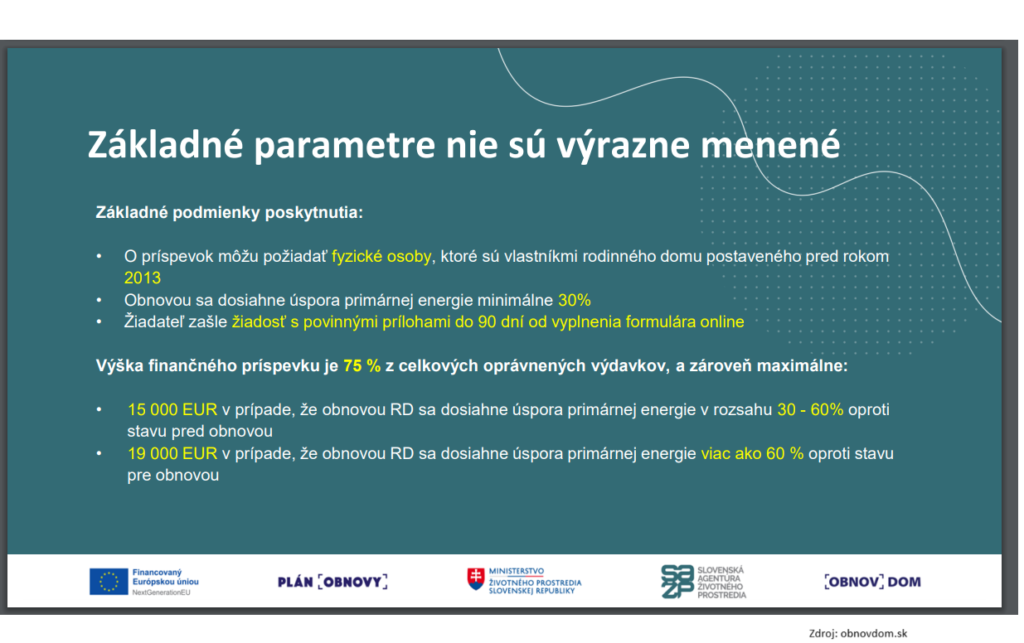 Maximálna výška príspevku je 15-tisíc eur v prípade, že obnovou domu sa dosiahne úspora primárnej energie v rozsahu 30 až 60 percent oproti pôvodnému stavu. Dá sa však získať aj viac. Až 19-tisíc (15-tisíc a bonus vo výške 4-tisíc eur) sa poskytne v prípade, že sa dosiahne úspora primárnej energie viac ako 60 percent. „Výška poskytovaného finančného príspevku je 75 percent celkových oprávnených výdavkov. Minimálna požadovaná úspora primárnej energie je 30 percent," konkretizujú podmienky programu.