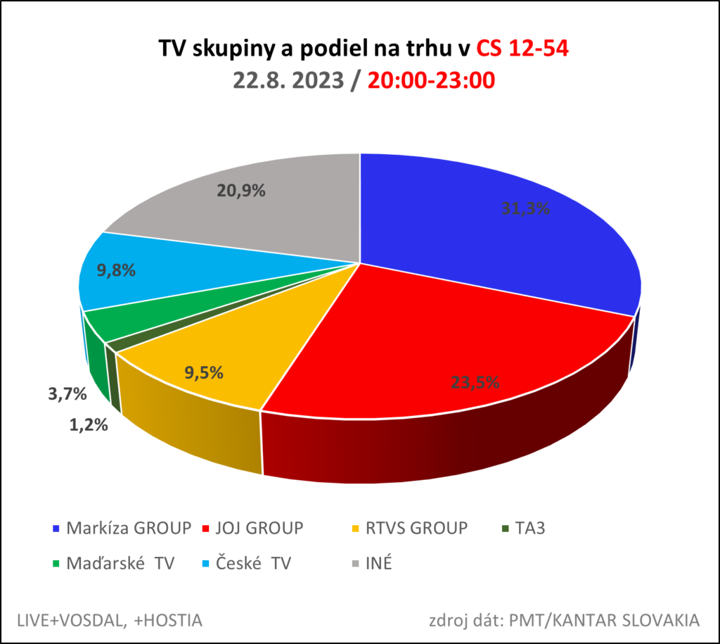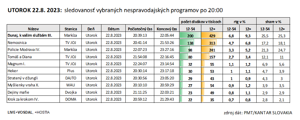 Najväčšou udalosťou televízneho večera bolo jednoznačne odvysielanie prvej časti tretej série dobového seriálu Dunaj, k vašim službám, ktorý plynule nadviazal na júnové ťaženie a s prehľadom dominoval v oboch kľúčových cieľovkách ako najsledovanejší program večera, ale aj celého dňa. V komerčnej cieľovke si Dunaj, k vašim službám III. pripísal rating 6,8 percenta a podiel na trhu 25,5 percenta. Oproti štartu prvej série rodinnej ságy, ktorá začínala 10. januára s ratingom 7,6 percenta (226-tisíc divákov) a druhej série, ktorej prvá epizóda dosiahla 21. marca rating 7,1 percenta (211-tisíc divákov), ide síce s pilotným ratingom tretej série na úrovni 6,8 percenta (200-tisíc divákov) o mierny pokles, avšak vzhľadom na koniec augusta, keď sú dovolenky ešte v plnom prúde, je to zanedbateľná výkonnostná odchýlka.