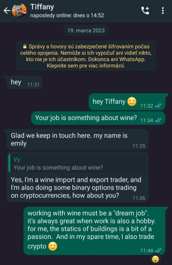 „Ja som jej povedal, kto som, čo robím a že niekedy vo voľnom čase sa snažím učiť o financiách. Ona sa ma spýtala, či obchodujem na nejakej burze. Odpovedal som, že áno, na burze Binance a že si dokážem k svojmu platu pomerne slušne privyrobiť. Konverzácia prebiehala ďalej, ona sa mi zverila, že robí niečo podobné, ale na inej platforme,“ spomína na začiatok konverzácie s Tiffany, Ján.