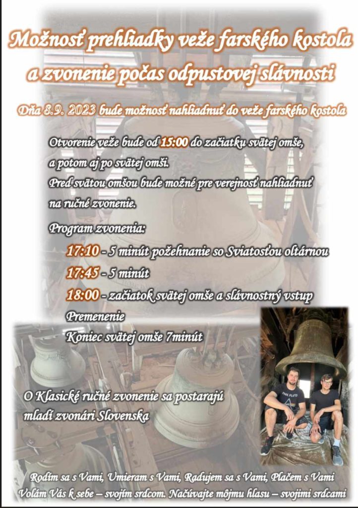 Počas dňa bude možnosť nahliadnuť aj do veže farského kostola a pred svätou omšou bude možné vidieť jedinečné ručné zvonenie v kostole. O to sa postarajú mladí zvonári Slovenska.