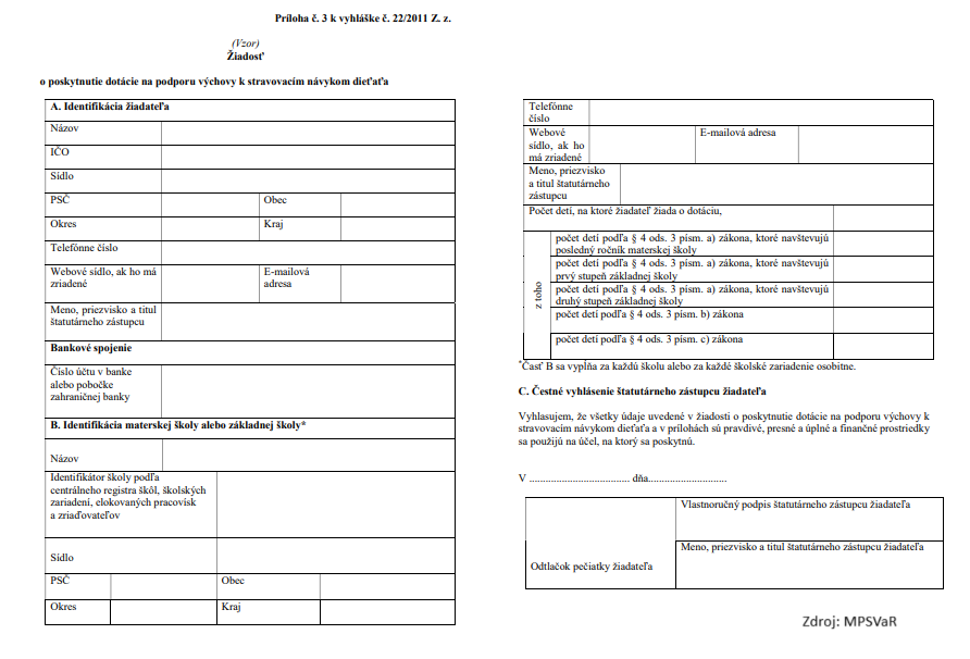 Pre novú oprávnenú skupinu detí na stredných školách poskytuje štát dotáciu na stravu vo výške 2,30 eura za každý deň, teda v rovnakej sume, ako v prípade detí na druhom stupni základnej školy. Rozdiel je, ak ide o individuálne predprimárne vzdelávanie detí v materskej škole. Tam je dotácia na stravu vo výške 1,40 eura za každý odobraný obed. Poskytnutie tejto pomoci nie je automatické, rodič dieťaťa musí o túto dotáciu písomne požiadať zriaďovateľa školy prostredníctvom školskej jedálne.