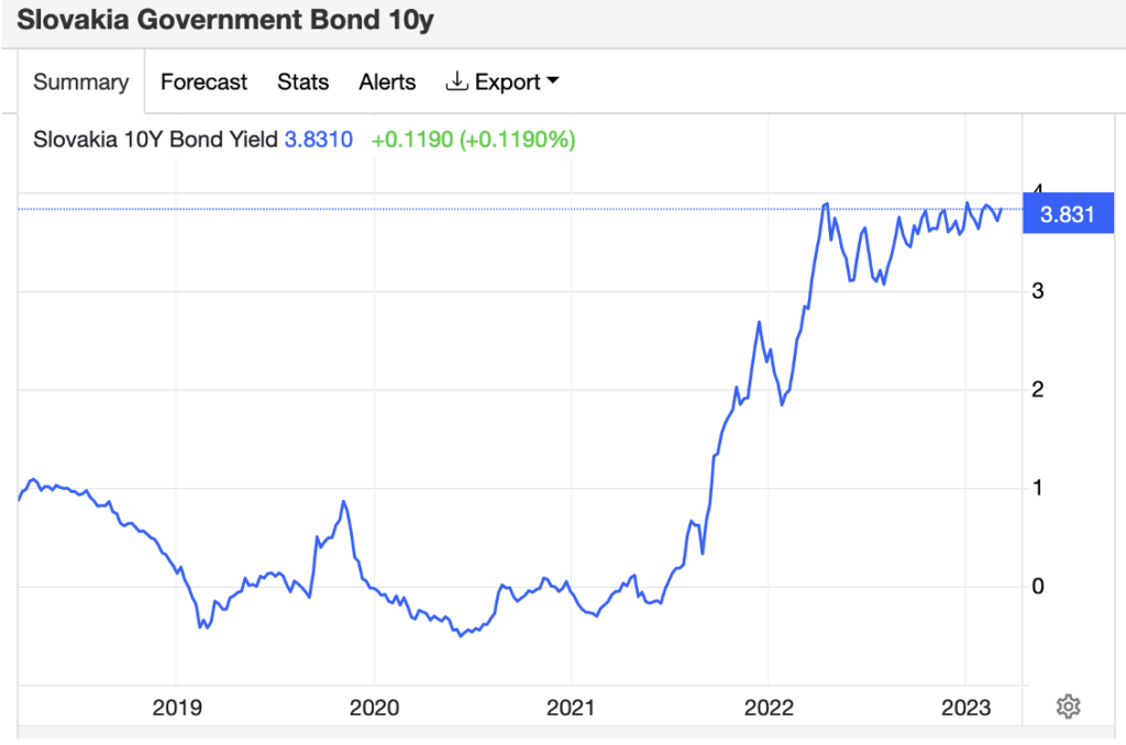 Hypotéky budú skutočne drahé, keď si zvolíme ďalšiu vládu „utrhnutú“ z výdavkovej reťaze. Deficity v čase, keď našich politikov nemôže zachraňovať ECB nákupom našich dlhopisov za novovytvorené peniaze, ale musíme sami úrokom presviedčať investorov, môžu viesť k tomu, že úrok na slovenských štátnych dlhopisoch bude rásť napriek stagnujúcemu alebo dokonca klesajúcemu základnému úroku ECB. Práve úroky na slovenských štátnych dlhopisoch sú určujúce pre úroky na hypotékach na Slovensku. Pri pohľade na vývoj 10-ročných slovenských štátnych dlhopisov a hlavne volebné sľuby to zatiaľ príliš na klesanie nevyzerá.