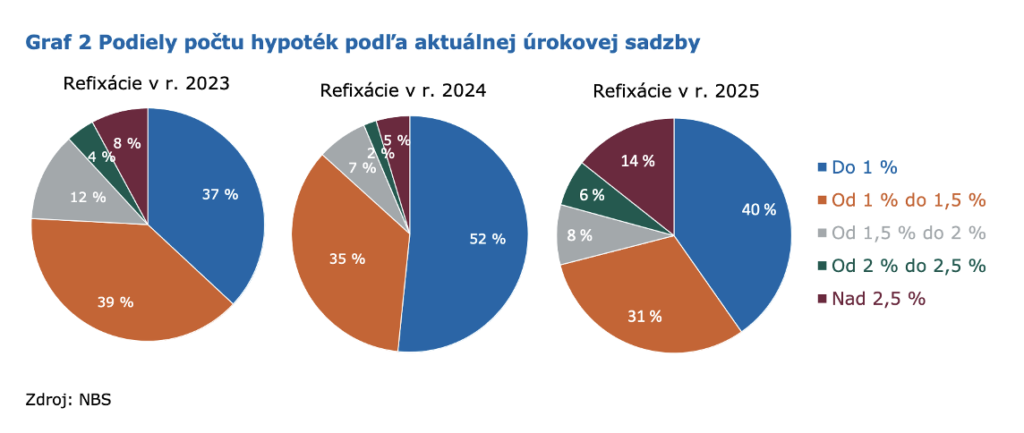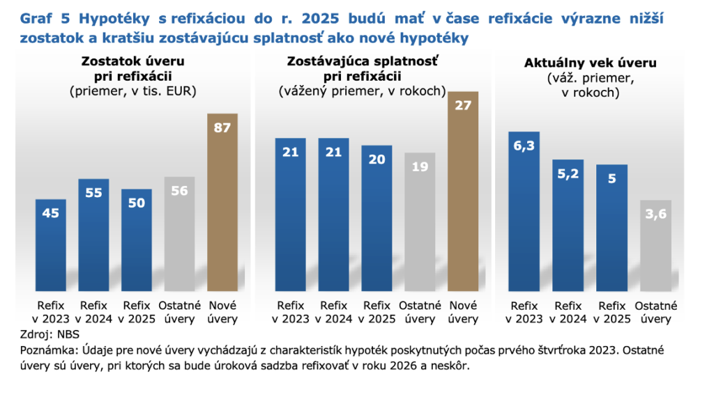 Časť hypoték je už totiž vysplácaná: „Pri hypotékach, ktoré čaká refixácia sadzby do konca roka 2025, bude ich priemerný zostatok v čase refixácie až o 42 percent nižší, ako je priemerná výška dnes poskytovaných hypoték. Navyše aj ich zostatková splatnosť bude výrazne kratšia. Hypotéky s refixáciou sadzby do roku 2025 budú mať v čase refixácie priemerný zostatok zhruba 51-tisíc eur a zostávajúcu splatnosť okolo 21 rokov, tvrdia analyticki centrálnej banky.