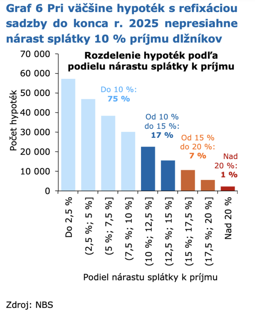 „Výraznejší nárast splátok (nad 300 eur) sa týka približne len 3 percent hypoték (teda zhruba 12-tisíc z nich). Napríklad nárast splátok o 500 eur a viac môžeme považovať za extrémny príklad, ktorý sa týka necelého pol percenta hypoték (okolo 1 500 hypoték). Ide pritom primárne o dlžníkov s vysokým príjmom a veľkou hypotékou,“ prízvukuje NBS.