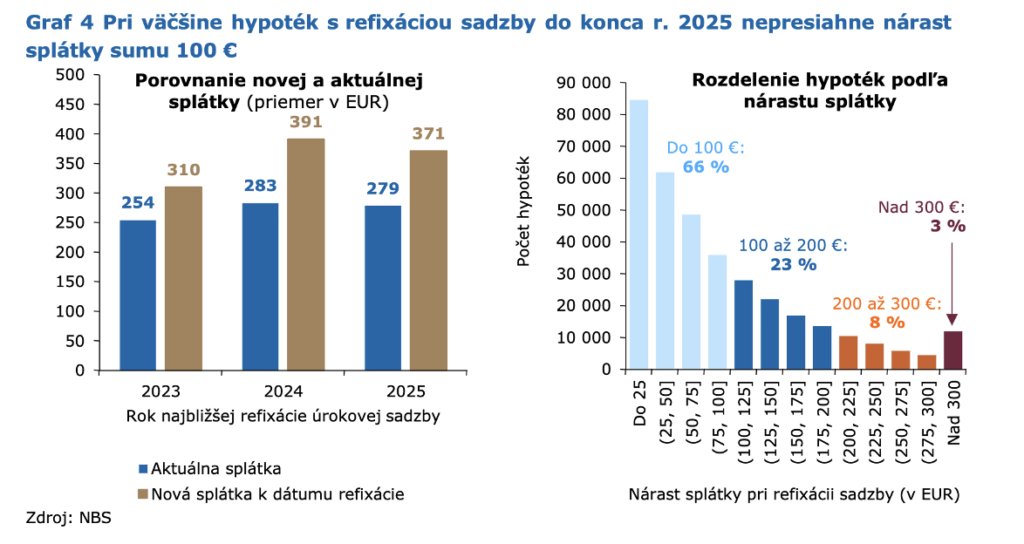 „Na účely výpočtov predpokladáme, že nová sadzba pri refixáciách bude v období od 31. marca 2023 do 31. decembra 2023 rovnomerne rásť zo štyroch na päť percent, pričom v rokoch 2024 a 2025 zostane na úrovni piatich percent. Ak sa pozrieme na refixácie do konca roku 2025, splátky v priemere vzrastú o 92 eur. Pri dvoch tretinách hypoték nárast splátky nepresiahne sumu 100 eur.“