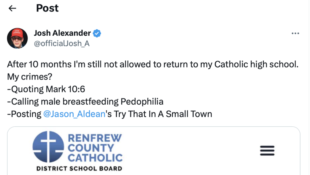 Začal sa nový školský rok a 12. septembra Josh na svojom X-účte napísal: „Po desiatich mesiacoch sa stále nemôžem vrátiť do školy. Moje zločiny? Citovanie Evanjelia Marka 10:6 a nazvanie mužského dojčenia pedofíliou.“