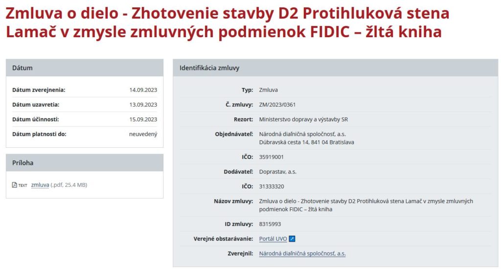 Na zverejnenie zmluvy v Centrálnom registri zmlúv (CRZ) upozornil na sociálnej sieti starosta mestskej časti Bratislava-Lamač Igor Polakovič. Cena za dielo je 21 869 039 eur bez DPH (26 242 846 eur s DPH). Odhadovaná cena zákazky pri vyhlásení verejného obstarávania pritom bola v januári 2023 vo výške 19 038 257 eur bez DPH.