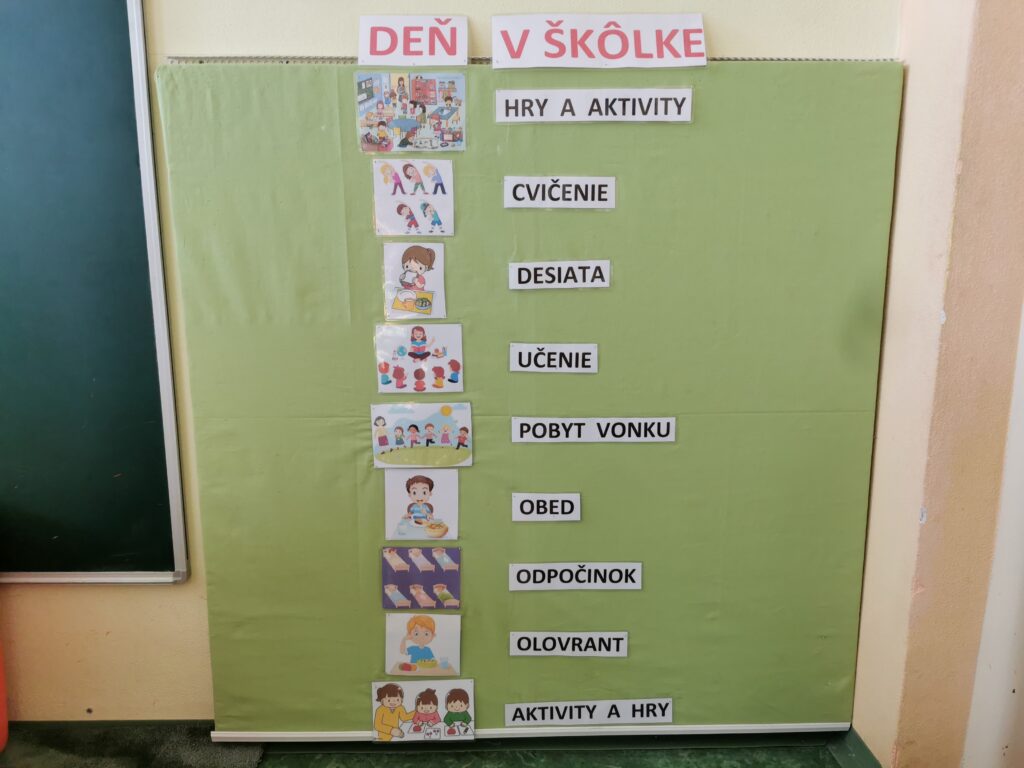 Je dobré vizualizovať mu rutinu denných činností, aby sa pomocou obrázkov vedelo orientovať počas dňa – čo robíme teraz, čo bude nasledovať potom. Poskytuje mu to pocit istoty, že vie, čo môže očakávať a zároveň vie, že deň v škôlke sa aj skončí a ono pôjde opäť domov.