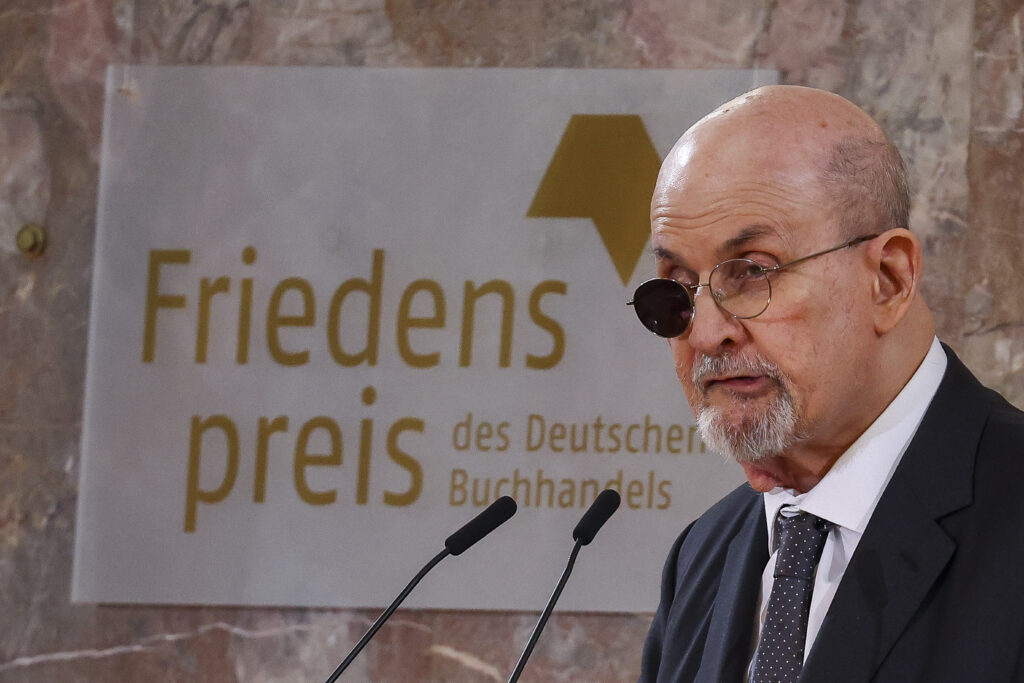 Salman Rushdie. Foto: TASR/AP Author Salman Rushdie speaks after receiving the Peace Prize of the German book trade (Friedenspreis des Deutschen Buchhandels) during a ceremony at the Church of St. Paul in Frankfurt, Germany, Sunday, Oct. 22, 2023. Rushdie called for the unconditional defense of freedom of expression as he received a prestigious German prize that recognizes his literary work and his resolve in the face of constant danger. (Kai Pfaffenbach/Pool Photo via AP) *** Local Caption *** príhovor