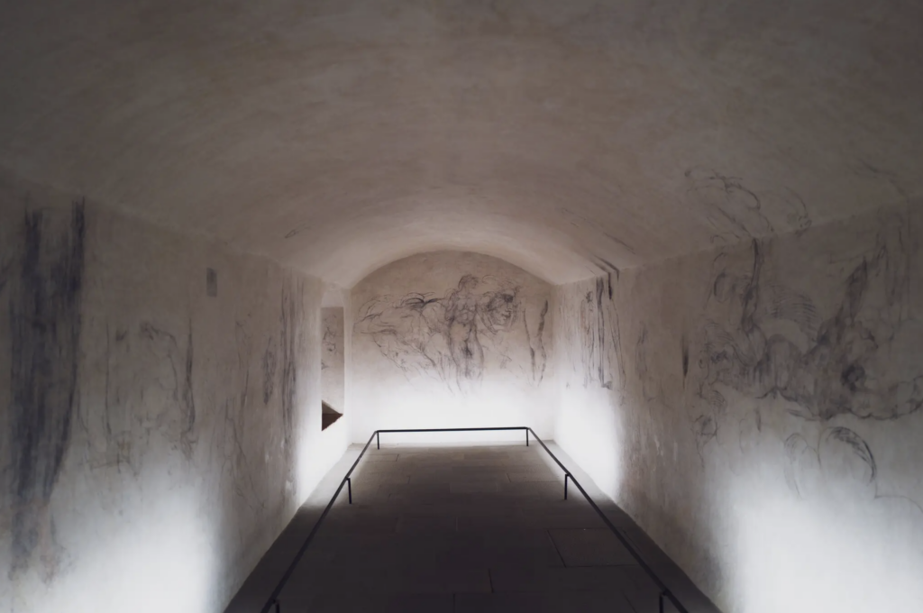 V úzkej klenutej miestnosti pod Múzeom medicejských kaplniek vo Florencii sú na stenách podozrivo majstrovské čmáranice.