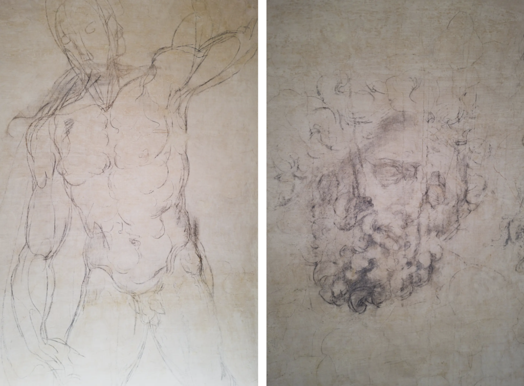 Jedným z nich je impozantný akt pri vchode, ktorý má náčrt tváre z profilu a pozerá sa dopredu. Podľa odborníkov evokuje Michelangelovo „Vzkriesenie Krista." Druhým je skica nôh. Iní odborníci naznačujú, že Michelangelo mohol nakresliť skice padajúceho muža, ktoré pripomínajú ústrednú postavu jeho „Pádu Faetóna." Niektorí si dokonca myslia, že ohnutá a bezvládna ruka na stene evokuje jeho sochu Dávida.