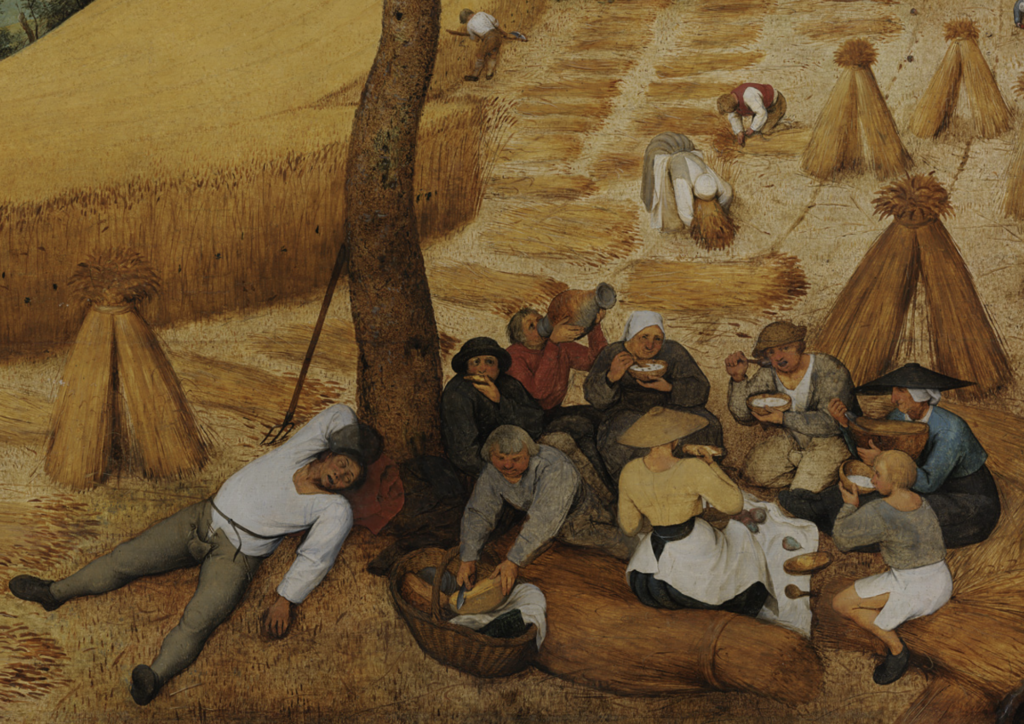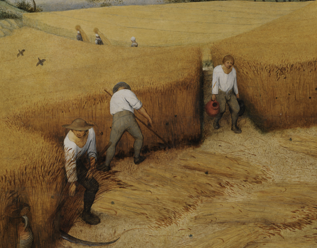 Niektorí roľníci sú znázornení pri jedle a odpočinku, zatiaľ čo iní kosia pšenicu, dochádza tým k zobrazeniu výroby aj spotreby potravín. Hrušky zas možno vidieť na bielom plátne pred vzpriamene sediacou ženou, ktorá pojedá chlieb a syr.