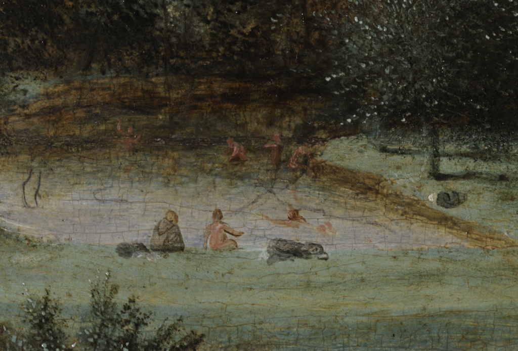Naľavo je zobrazená scéna, na ktorej sa rehoľníci v horúcom letnom počasí kúpu v jazere.