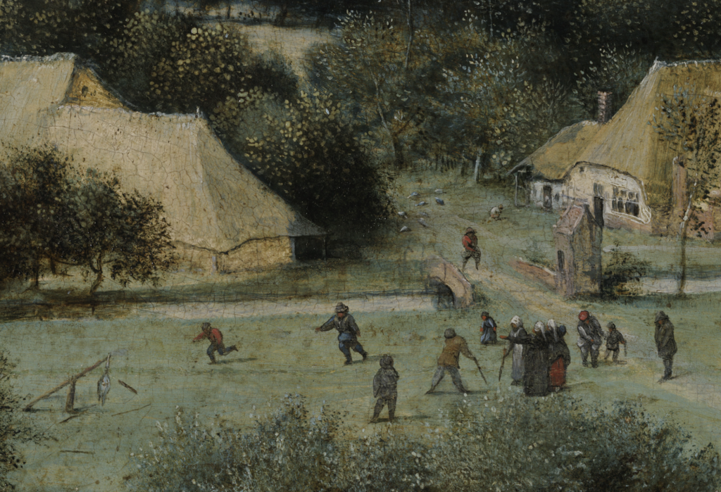 Obraz zachytáva veľké množstvo činností typických pre miestny vidiecky život 16. storočia. V ľavej strednej časti je skupina dedinčanov, ktorí sa zúčastňujú na obľúbenom dobovom krvavom športe – hode kohúta. Pri tejto „zábave" bol kohút priviazaný k stĺpu a ľudia sa striedali v hádzaní kohútov (špeciálnych tyčí so závažím) na vtáka, kým nezahynul na následky zranení.