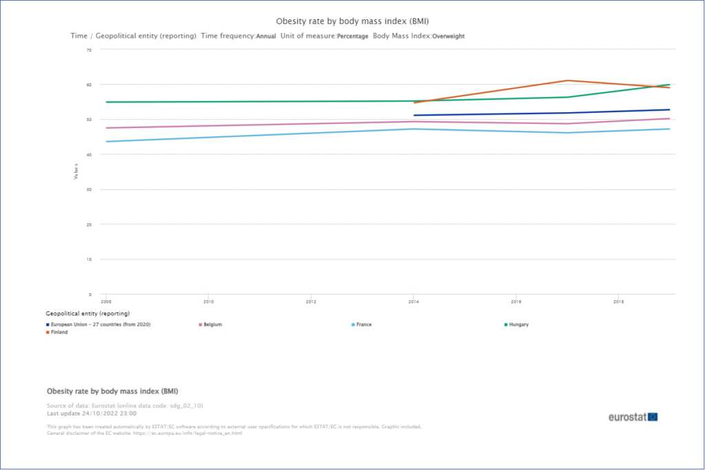 Dve zo štyroch spomenutých krajín sa v rebríčku nadváhy (index BMI vyšší ako 25) nachádzajú nad priemerom EÚ, do ktorého spadá viac ako polovica jej obyvateľov. V týchto krajinách došlo dokonca k nadpriemernému zvýšeniu miery nadváhy. Vo Fínsku o 6,4 percentuälneho bodu medzi rokmi 2014 a 2017 a v Maďarsku o 1,1 p.b. V krátkom období sa pokles podarilo dosiahnuť len v Belgicku a Francúzsku. V konečnom výsledku však želaný cieľ dosiahlo, zdá sa, len Francúzsko, kde sa podiel obyvateľov s nadváhou relatívne stabilizoval.