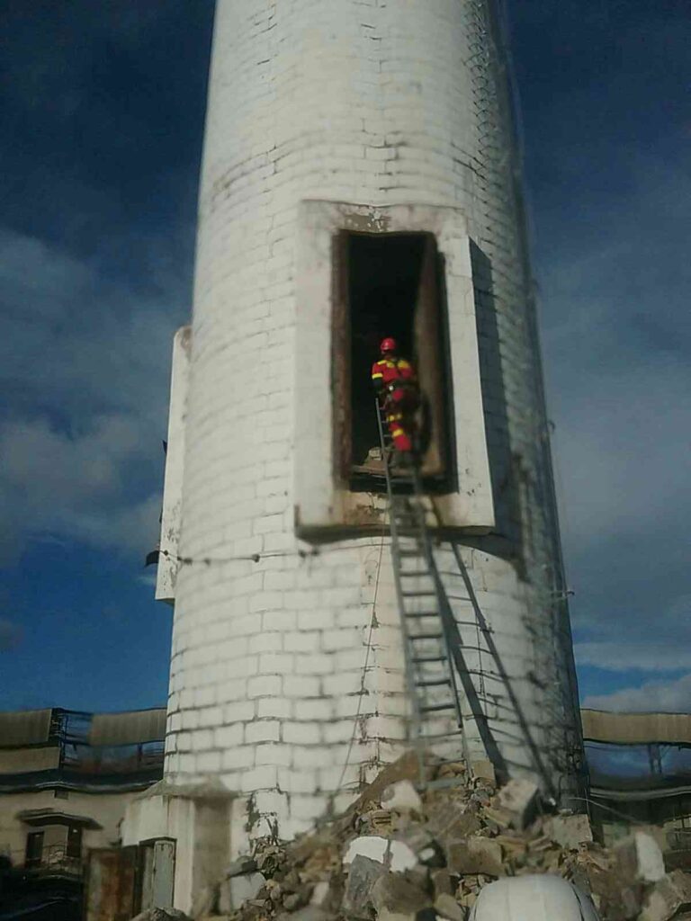 Zranenú osobu sa medzitým ďalším trom kolegom pracujúcim na komíne podarilo vytiahnuť späť na plošinu, kde jej okamžite poskytli prvú pomoc.