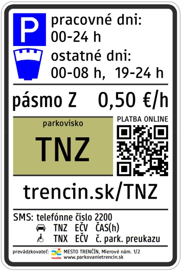 Ako informuje portál parkovanietrencin.sk, podľa platnej legislatívy nemôžu byť pod značkou P – Parkovisko umiestnené detailné informácie o parkovaní. Informácie o parkovaní a spôsoboch úhrady nájdete na samostatných infotabuliach. Tie budú umiestnené z opačnej strany značky P – Parkovisko, prípadne na samostatných stĺpikoch.