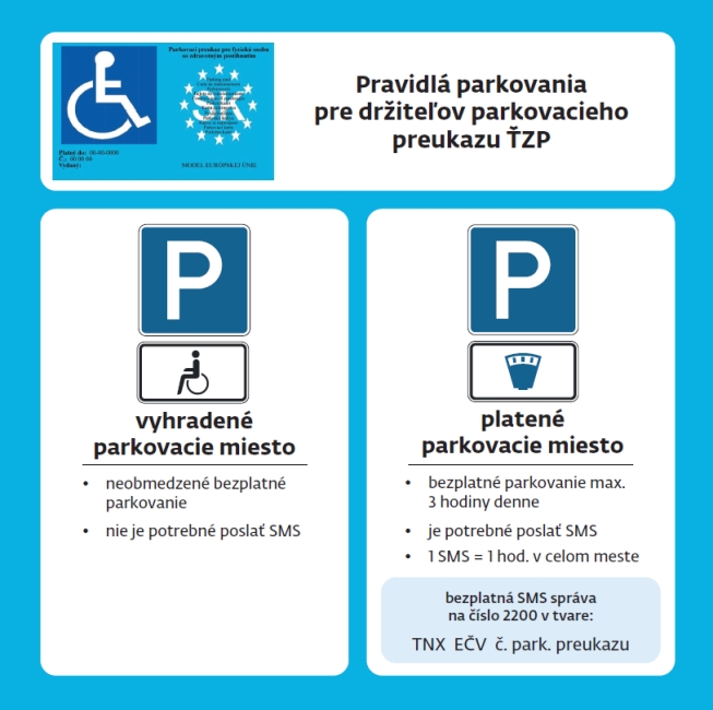 Od 18. novembra 2023 došlo k zmenám pri parkovaní pre držiteľov parkovacieho preukazu ŤZP vydaného úradom práce sociálnych vecí a rodiny. Naďalej môžu parkovať bezplatne na vyznačených miestach ŤZP, s preukazom umiestneným za čelným sklom. Na spoplatnených parkovacích miestach môžu parkovať buď s vybavenou zvýhodnenou parkovacou kartou ŤZP (v závislosti podľa jej typu a územnej platnosti) alebo po odoslaní SMS na číslo 2200. Odoslanie SMS je bezplatné.