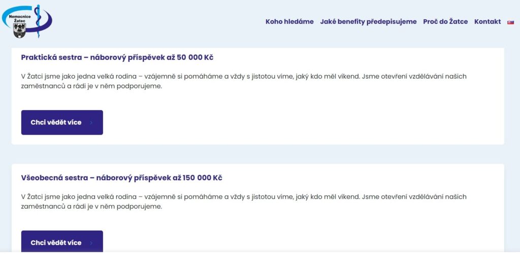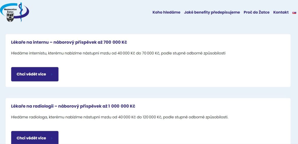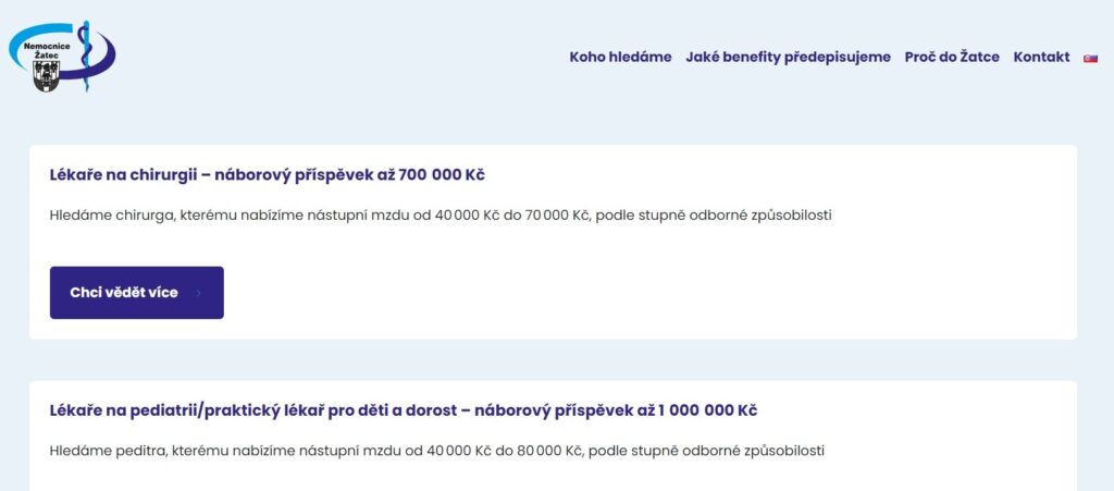 Ak by si niekto myslel, že vysoké náborové príspevky ponúkajú len veľké nemocnice, mýli sa. Napríklad v meste Žatec, kde žije necelých 20-tisíc obyvateľov, sa poriadne buchli po vrecku a internistovi ponúkajú 700-tisíc českých korún, rádiológom a pediatrom dokonca milión. Sestrám od 150- do 500-tisíc českých korún. Zaujímalo nás, ako je to v slovenských nemocniciach. Z komunikačného oddelenia siete Penta Hospitals na naše otázky nereagovali. Odpoveď z UNLP Košice bola veľmi všeobecná.