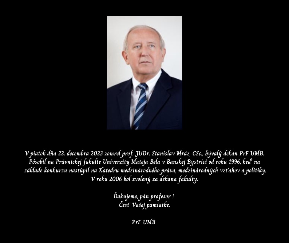 V piatok dňa 22. decembra 2023 zomrel prof. JUDr. Stanislav Mráz, CSc., bývalý dekan PrF UMB Univerzity Mateja Bela. „Pôsobil na Právnickej fakulte UMB v Banskej Bystrici od roku 1996, keď na základe konkurzu nastúpil na Katedru medzinárodného práva, medzinárodných vzťahov a politiky. V roku 2006 bol zvolený za dekana fakulty. Ďakujeme, pán profesor! Česť Vašej pamiatke," informovala PrF UMB na svojej stránke.