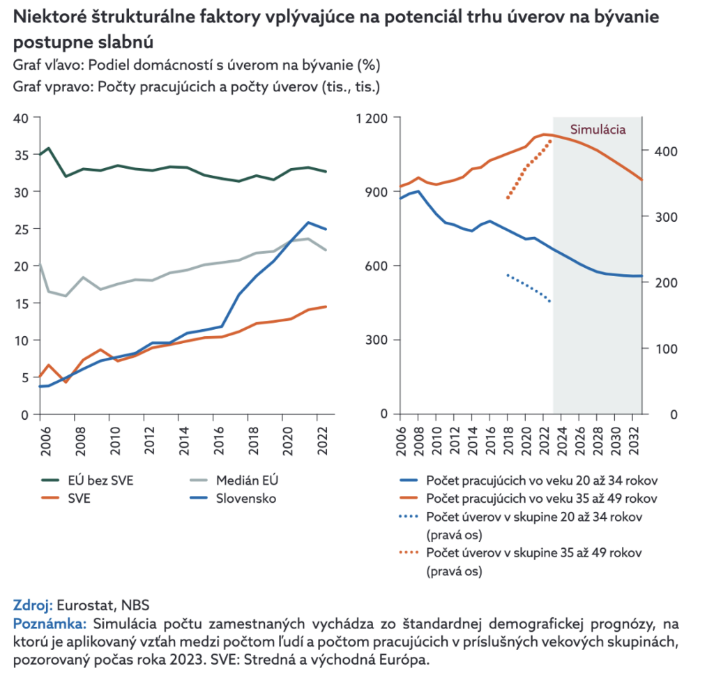 Pri potenciálnom znovurozbehnutí hypoték NBS poukazuje na to, že podiel slovenských domácností s hypotékou je už vysoko nad priemerom krajín strednej a východnej Európy a dokonca už aj nad mediánom Európskej únie. Zároveň rýchlo klesá počet pracujúcich vo veku 20 až 34 rokov a klesať začala už aj skupina pracujúcich vo veku 35 až 49 rokov.