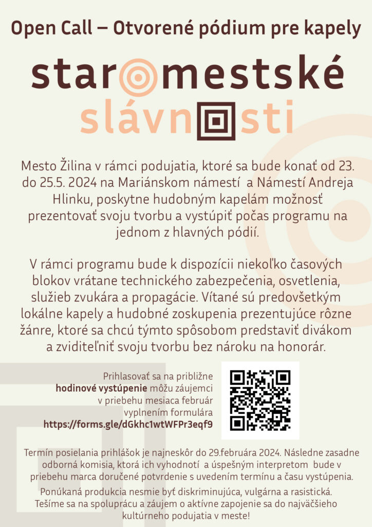 Už 28. ročník Staromestských slávností v Žiline sa bude konať v termíne od 23. do 25. mája 2024. Počas troch dní sa na dvoch pódiách vystrieda viacero známych interpretov slovenskej hudobnej scény. Zvučné mená kapiel ako Vidiek či The Backwards doplnia po novom aj iní lokálni umelci. Svoj hudobný talent a autorskú tvorbu budú môcť predstaviť na Otvorenom pódiu – Open call.
