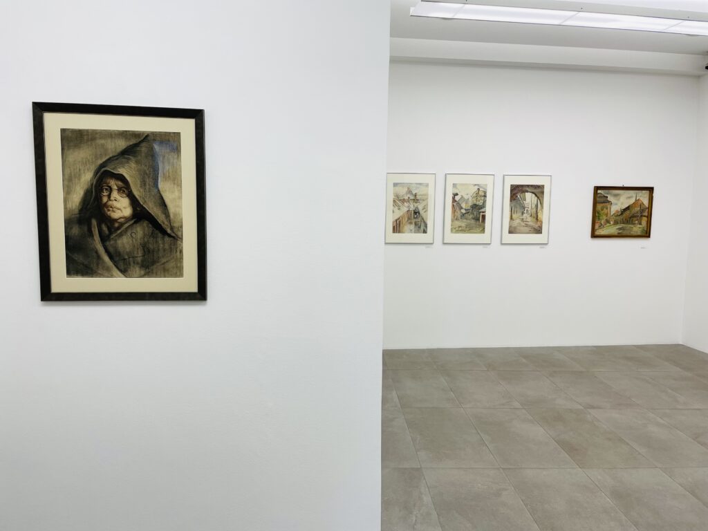 Pohľad na výstavu Ľudovíta Felda v bratislavskej Galérii G19 (v popredí Autoportrét zo zbierky Múzea Vojtecha Löfflera v Košiciach). Foto: Matúš Zajac
