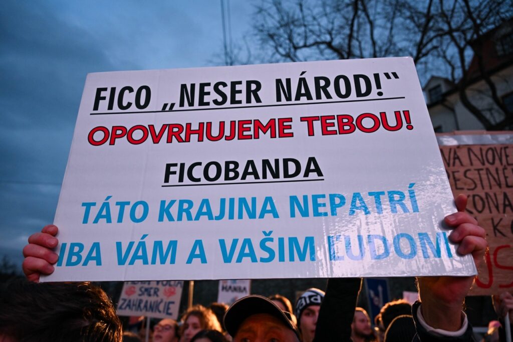 Demonštranti so sebou niesli najrôznejšie transparenty namierené proti kabinetu Roberta Fica, vlajky Slovenska či Európskej únie a skandovali heslá ako „dosť bolo Fica“, prípadne "hanba" alebo „vylezte zbabelci“.