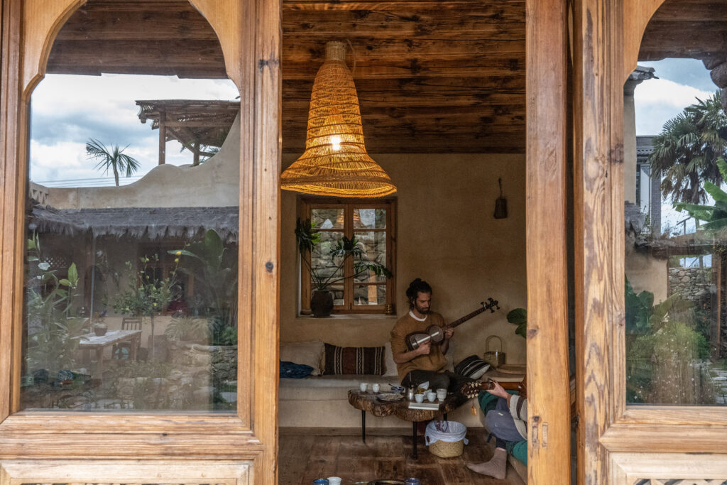Terapeutická atmosféra bola obzvlášť hustá vo Veggie Ark, rozľahlom komplexe severne od starého mesta, kde sa nachádza vegánska jedáleň, štúdiá jogy, lekcie gongu a dielňa farbenia. Nakoniec k nemu bude patriť aj „laboratórium sebestačnosti", ktoré 34-ročný Tchang Kuan-chua staval na nádvorí: ručne postavená drevená kupola, ktorá bude po dokončení poháňaná solárnou energiou a bude slúžiť ako výstavný priestor pre remeselné výrobky vyrobené z miestnych materiálov.