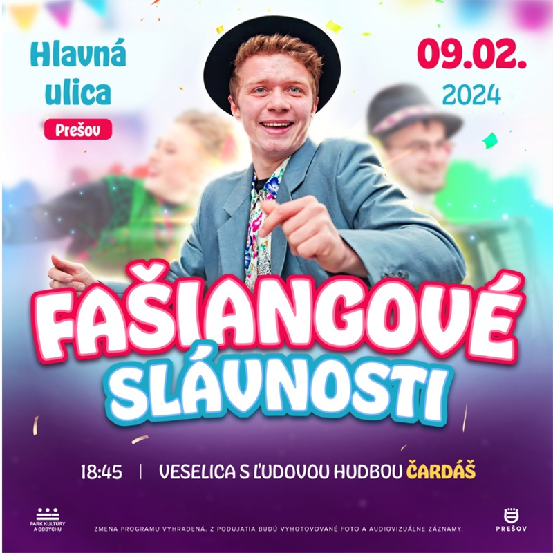 Fašiangový sprievod plný folklórnych súborov z prešovského kraja nás tancom, spevom a vinšovaním prevedie Hlavnou ulicou v Prešove. Nezabudnuteľnú atmosféru fašiangov v centre mesta tento rok vytvorí 9 folklórnych súborov: FS Šarišan, FS Starišan, DFS Šarišanček, DFS Dúbravienka, FS Šariš, FS Karpaťanin, Keľemešské furmani, SS Koňarečka a Prešovskí heligonkári. Tešiť sa môžete aj na chutné jedlo a nápoje, ktoré budú pripravené v predajných stánkoch. Fašiangové slávnosti vyvrcholia veselicou s Ľudovou hudbou ČARDÁŠ.
