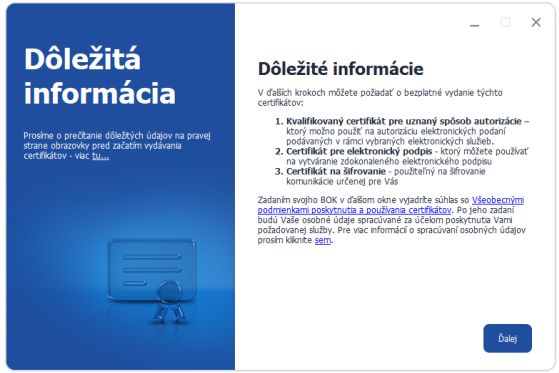 V aplikácii vie užívateľ požiadať o vydanie certifikátu jedným kliknutím. Na tento účel potrebuje nastaviť podpisový PIN a PUK kód, ale len v prípade, že ich doposiaľ nastavené nemal. V ďalšom kroku mu aplikácia ponúkne zoznam certifikátov, ktoré mu môžu byť vydané. V našom konkrétnom prípade tam bude uvedený „kvalifikovaný certifikát pre uznaný spôsob autorizácie“.