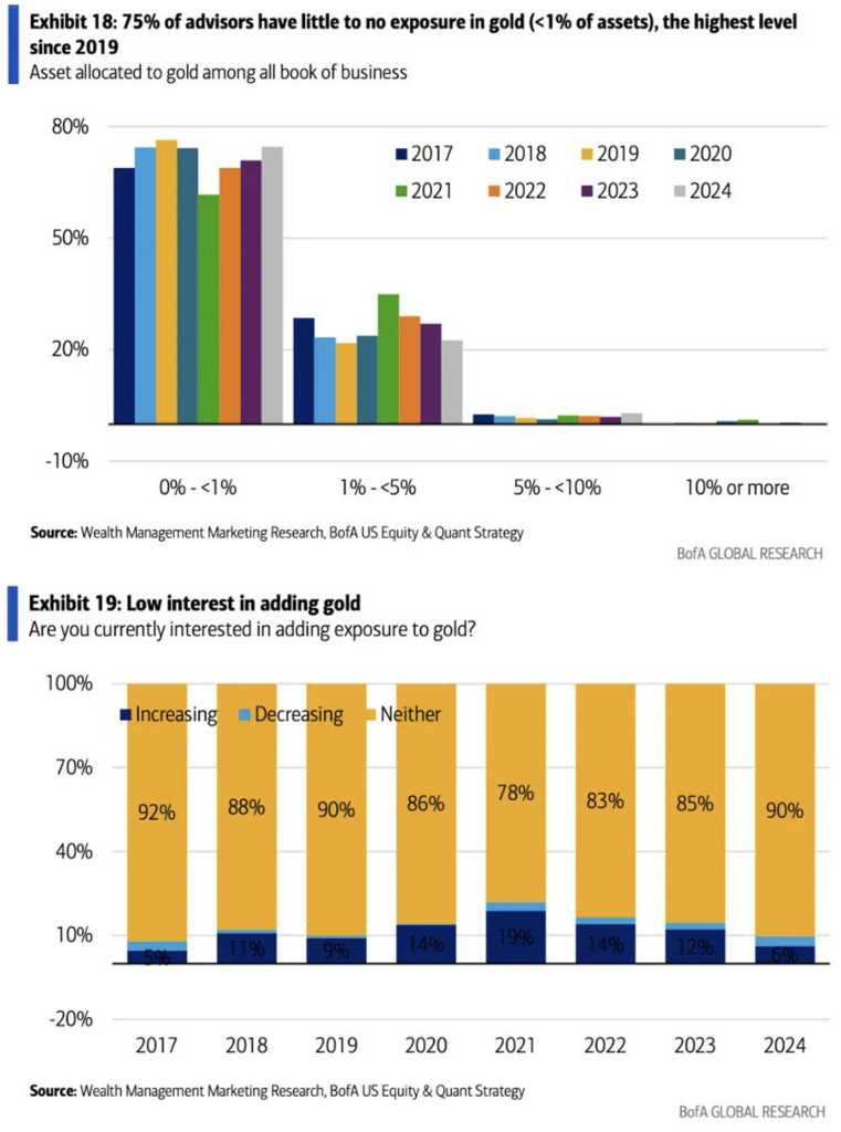 Kým veľryby nakupujú, investičný planktón v podobe bežných investorov zlata, napriek jeho historickým nominálnym rekordom, stále veľa nevlastní. Dá sa to vidieť na správaní finančných poradcov. Až 75 percent z nich nemá takmer žiadne zlato (menej ako 1 percento hodnoty aktív), čo je najviac od roku 2017. Vyše 90 percent z nich ani nemá v pláne žiadne dodatočné zlato nakupovať.