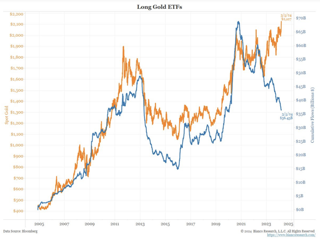 Veľa z peňazí tečúcich do bitcoinu zrejme pochádza aj zo zlatých ETF-iek. Predsa len, bitcoin v dnešnom systéme zlých peňazí plní podobné funkcie ako zlato. Preto spolu súťažia o rovnakých používateľov.