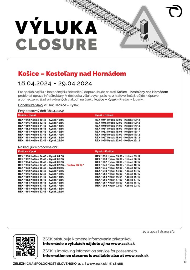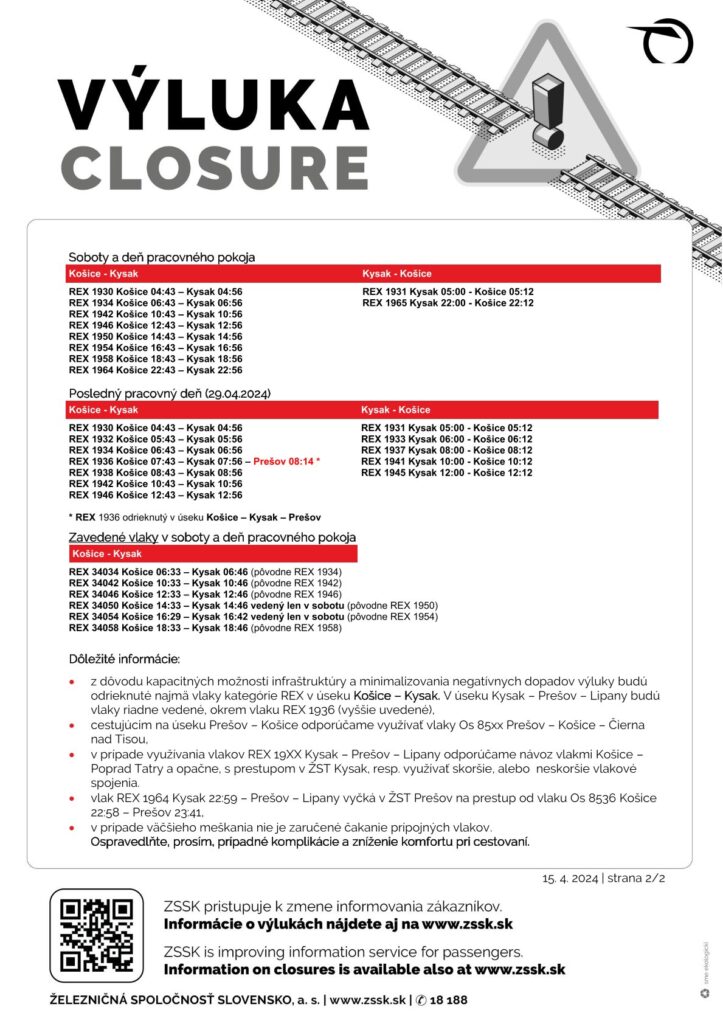 Vo štvrtok 18. apríla je medzi Košicami a Kysakom odrieknutých 16 spojov vlakov REX. V nasledujúcich pracovných dňoch 24, v soboty a deň pracovného pokoja 10 a v pondelok 29. apríla 12 spojov. Cez víkendy je zavedených šesť spojov.