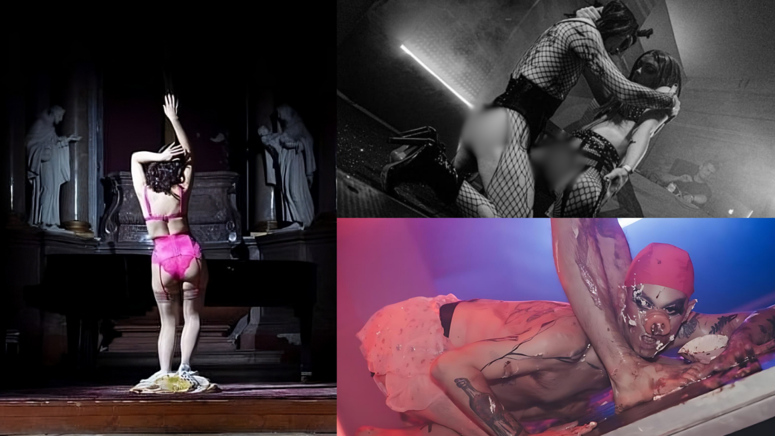 Vľavo: transsexuál Charlotte Srnčík vystupuje v Klariskách. V strede v vpravo: burleska Error Fatale tancuje na rovnakom mieste. Reprofoto Instagram