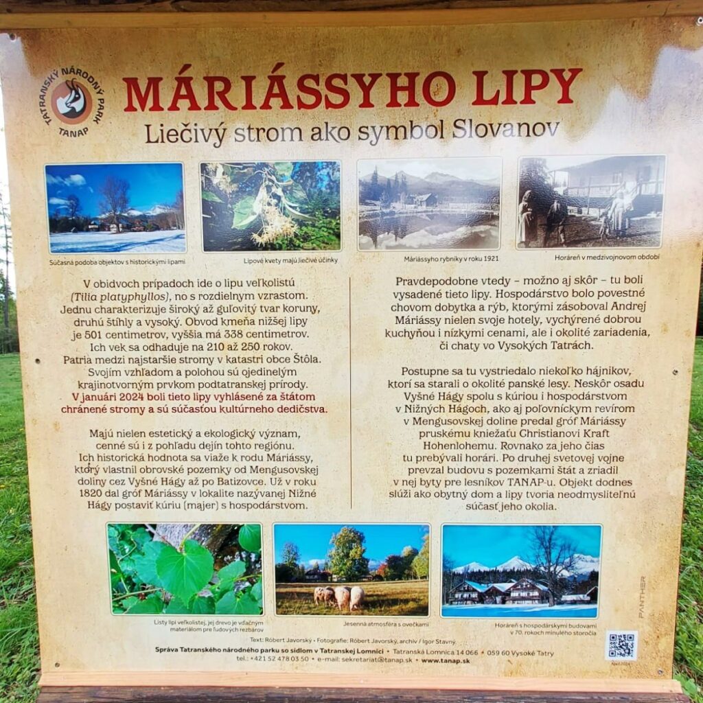 „Budovu kúrie a hospodárstva postavili v Nižných Hágoch v roku 1820 a pravdepodobne v tých rokoch, alebo o niečo skôr, vysadili aj lipy. Bolo tam rybné hospodárstvo, z ktorého Andrej Máriássy zásoboval rybami prvé hotely vo Vysokých Tatrách. Neskôr kúria patrila rodu Hohenlohe," píše sa ďalej v projekte.