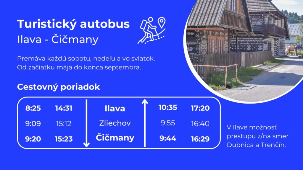 Nový turistický autobus vyráža dvakrát denne oboma smermi na trase z Ilavy cez Zliechov do Čičmian, odkiaľ môžete pokračovať do Rajeckých Teplíc. Autobus jazdí cez víkendy a sviatky do konca septembra. Z Ilavy smer Čičmany - 8:25 a 14:31 a z Čičmian smer Ilava - 9:44 a 16:29.