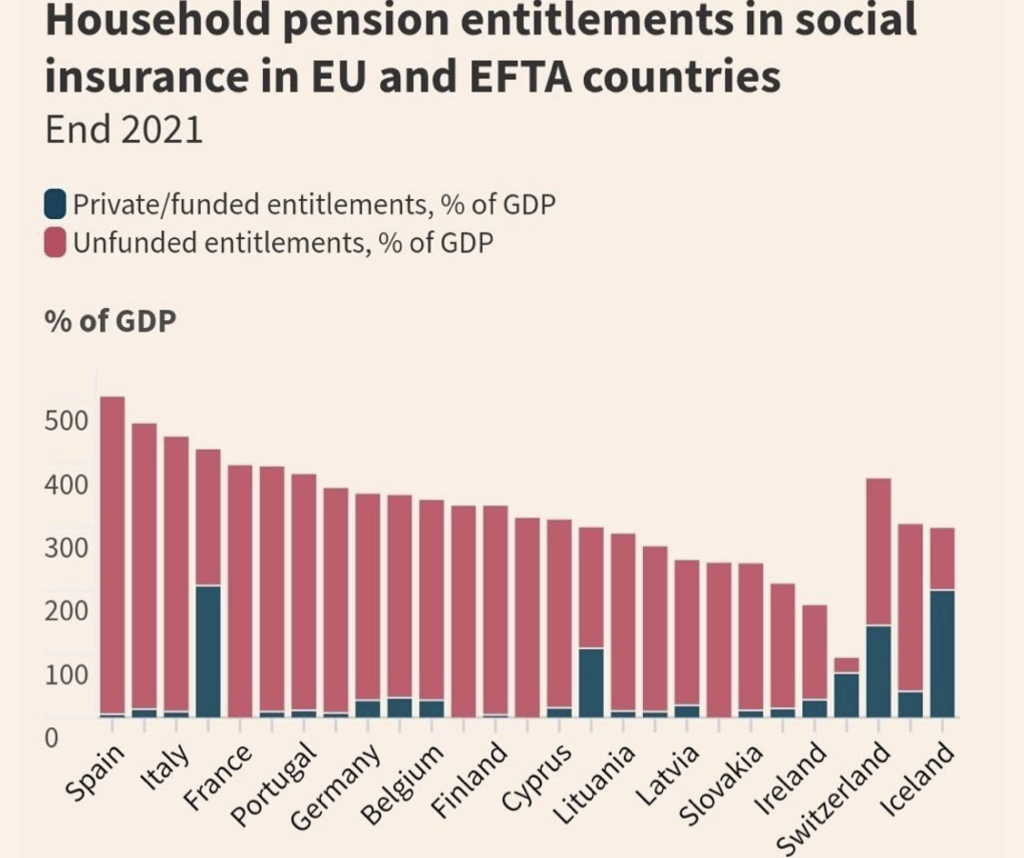 Nekryté budúce dôchodkové nároky voči štátu (červeným) ako percentá HDP.