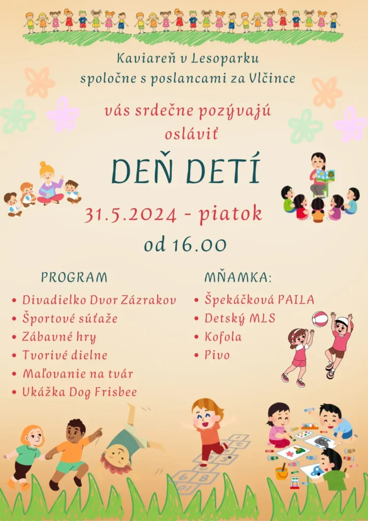 Taktiež sa 31. mája v Žiline uskutoční oslava Dňa detí v lesoparku. Pre všetkých milovníkov prírody je pripravený pestrý program, ktorý zahŕňa divadelné predstavenie Dvor zázrakov, rôzne súťaže, hry, maľovanie na tvár a tvorivé dielne. Ukážka Dog frisbee pridá do programu zaujímavý prvok. Deti budú mať tiež možnosť ochutnať špekáčiky pečené netradičným spôsobom. Toto podujatie sa koná v kaviarni v lesoparku a organizujú ho spoločne s poslancami za Vlčince.