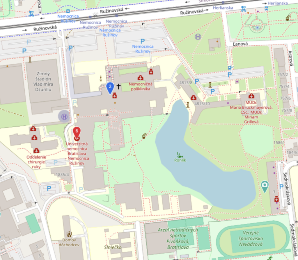 Ružinovská nemocnica sa nachádza v hustej zástavbe. Štát v roku 2019 prehral súd a bratislavský magistrát získal kompletne pozemky okolo jazera Rohlík, pod ružinovským zimným štadiónom až po budovu Rosum.