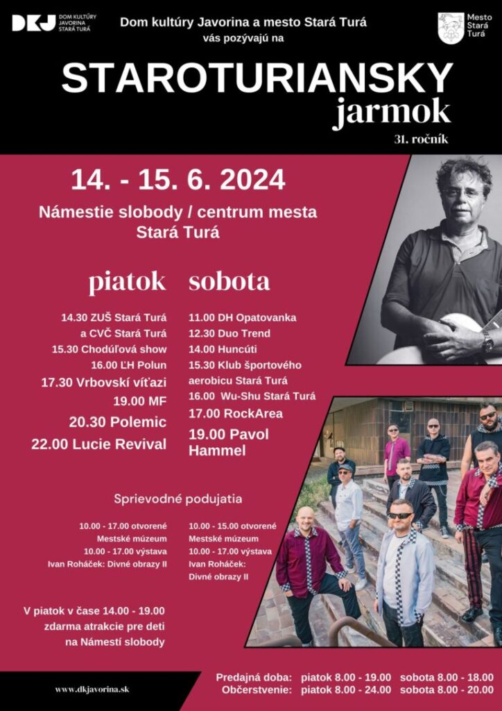 Pódiovú scénu obohatí aj úspešný Klub športového aerobicu, Wu – Shu centrum Stará Turá a blues-rocková kapela RockArea z Trenčína. Zlatým klincom dvojdňového kultúrneho programu bude koncert speváka, skladateľa a hudobného producenta Pavla Hammela.