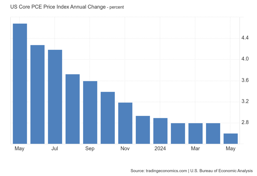 V medziročnom vyjadrení jadrová PCE inflácia v máji spomalila na 2,6 percenta z 2,8 percenta v predchádzajúcom období. Inflácia PCE tak dopadla veľmi dobre, nebol dôvod na paniku. Trhy znova oživili scenár, že nakoniec dôjde k mäkkému pristátiu.