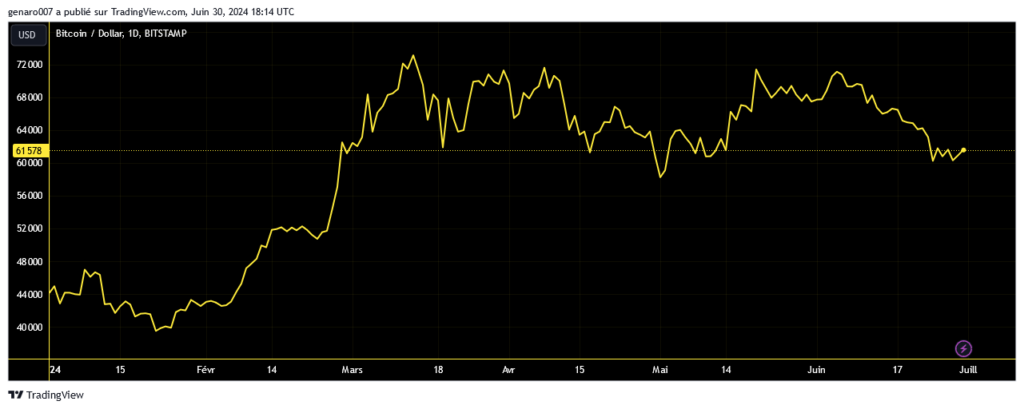 Vývoj ceny bitcoinu od začiatku roka 2024.