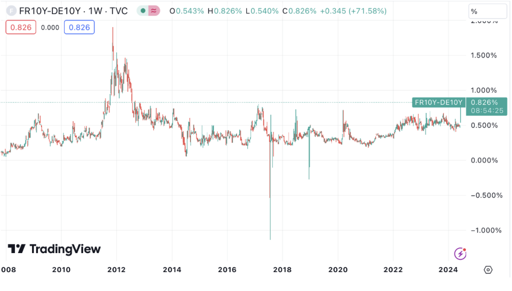Rozdiel vo výnosoch dvoch najdôležitejších krajín eurozóny Francúzska a Nemecka presiahol 80 bázických bodov, čo je najviac od krušných rokov, v ktorých reálne hrozil rozpad eurozóny.