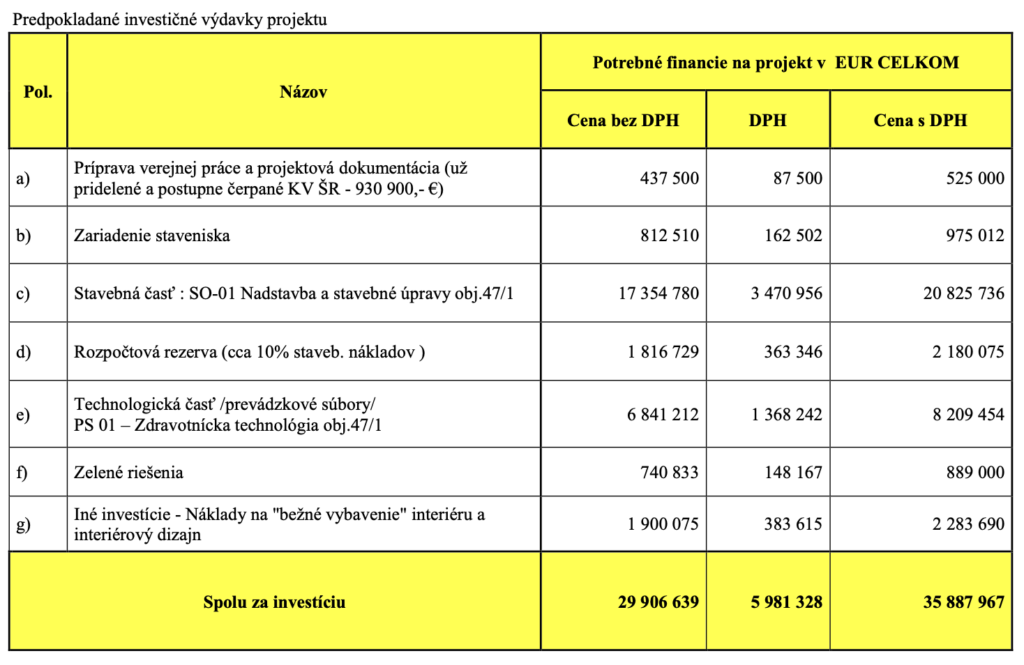 Stavebné úpravy a nadstavba majú byť podľa harmonogramu hotové do júna 2028. Projekt má dokopy stáť takmer 36 miliónov eur a financie naň pôjdu z kapitoly Ministerstva zdravotníctva SR. To sa bude neskôr uchádzať aj o refundáciu časti výdavkov prostredníctvom eurofondov.