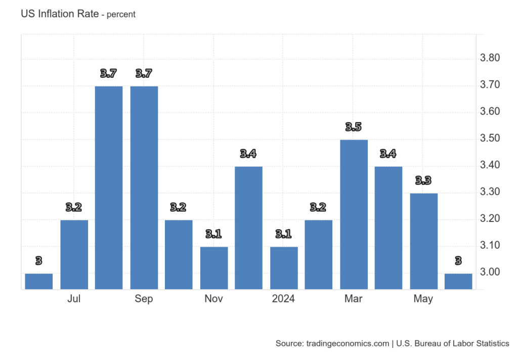 Všeobecná inflácia v USA dosiahla za mesiac jún medziročne 3 percentá, pri očakávaní analytikov 3,1 percenta. Medzimesačne sme zaznamenali značné spomalenie, keď v máji bola inflácia v USA ešte na úrovni 3,3 percenta.