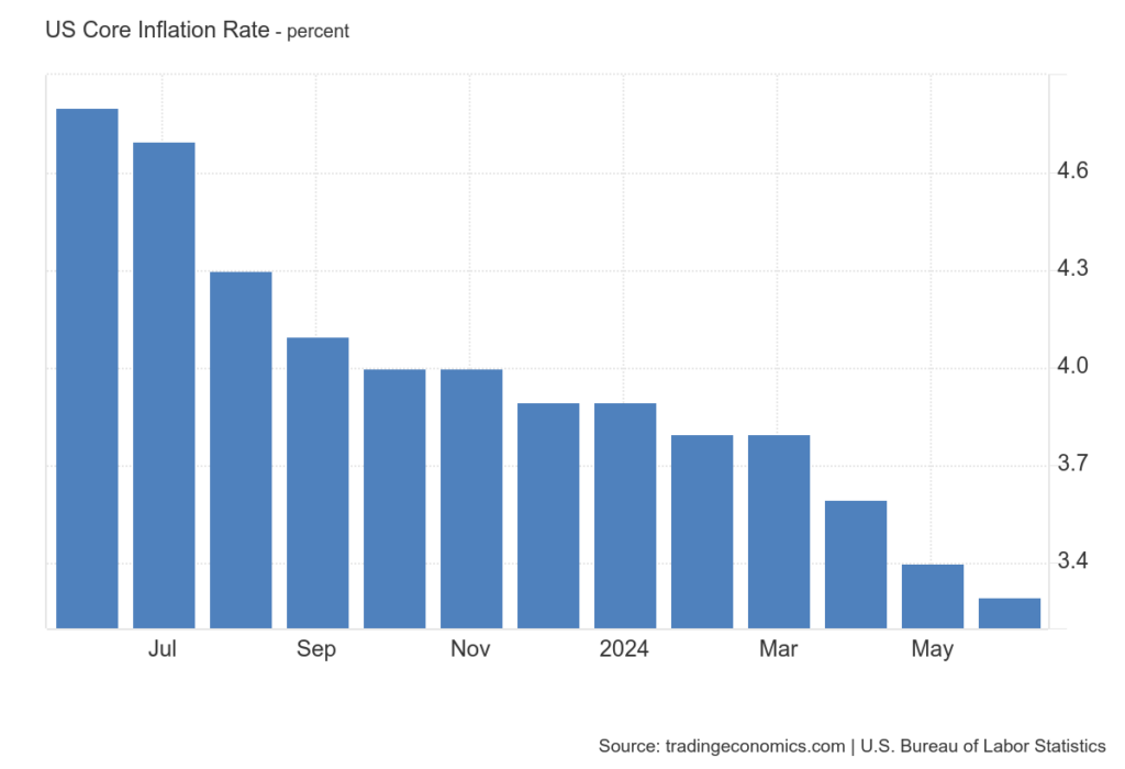 Súčasne sme sa dozvedeli aj jadrovú infláciu v USA, ktorá vo svojom výpočte nezohľadňuje dve najvolatilnejšie zložky inflácie, teda jedlo a energie. Americká jadrová inflácia dosiahla v júni 3,3 percenta oproti očakávaným 3,4 percenta. Aj tu došlo k poklesu oproti predchádzajúcim mesiacom.