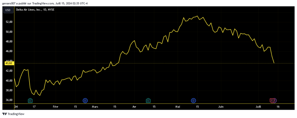 Výsledkovú sezónu za druhý štvrťrok 2024 otvorili výsledky leteckej spoločnosti Delta Air Lines. Samy čísla za druhý kvartál neboli až také zlé. Tržby síce boli ľahko pod odhadmi analytikov a dosiahli 15,4 miliardy dolárov namiesto predikovaných 15,47 miliardy. Zisk na jednu akciu bol v súlade s očakávaním a dosiahol 2,36 dolára, čo je medziročne o niečo menej, keď bol 2,68 dolára.