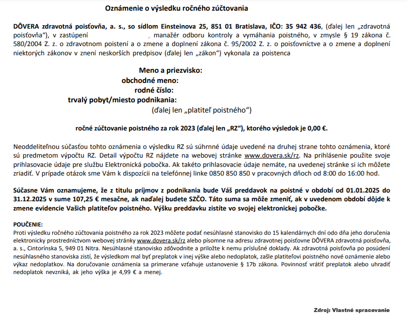 Vyššie uvedené oznámenie je z poisťovne Dôvera, ktorá poistencov o vykonaní svojej povinnosti informovala esemeskou, zúčtovanie bolo doručené prostredníctvom aplikácie. Okrem podpísaného dokumentu v nej však nájdete aj oveľa podrobnejší výpočet – Detail výpočtu.