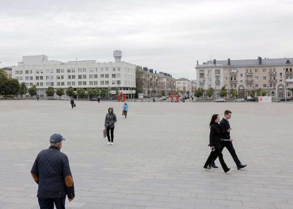 Veľké centrálne námestie v Belgorode je teraz väčšinou prázdne, okrem bezpečnostných zložiek, ktoré strážia betónové prístrešky na každom rohu. Mestské neoklasicistické divadlo zo sovietskej éry je lemované obrazovkami s videami, na ktorých sa prehrávajú techniky prvej pomoci a inštrukcie, ako si okoloidúci majú privolať pomoc, ak uviaznu v troskách.